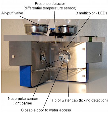 RFID transponder tagged animals are individually recognized in the fully automated conditioning corners that evaluate spontaneous behavior, operant/associative learning and memory. The four corners are equipped with sensors (continuous 24h-recording of behavioral events) and actors (allowing the system to feedback on animals’ behavior in a pre-defined way). Together with the software package using a programmable user interface, this unique sensor/actor principle grants direct behavioral shaping of group-housed animals in an all-in-one system according to diverse research interests. The visually designed paradigms run fully automated, allowing for efficient continuous testing and monitoring of large experimental animal cohorts.